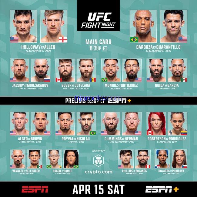 UFC on ESPN: Holloway vs. Allen was a mixed martial arts event produced by the Ultimate Fighting Championship that took place on April 15, 2023, at the T-Mobile Center in Kansas City, Missouri, United States.
